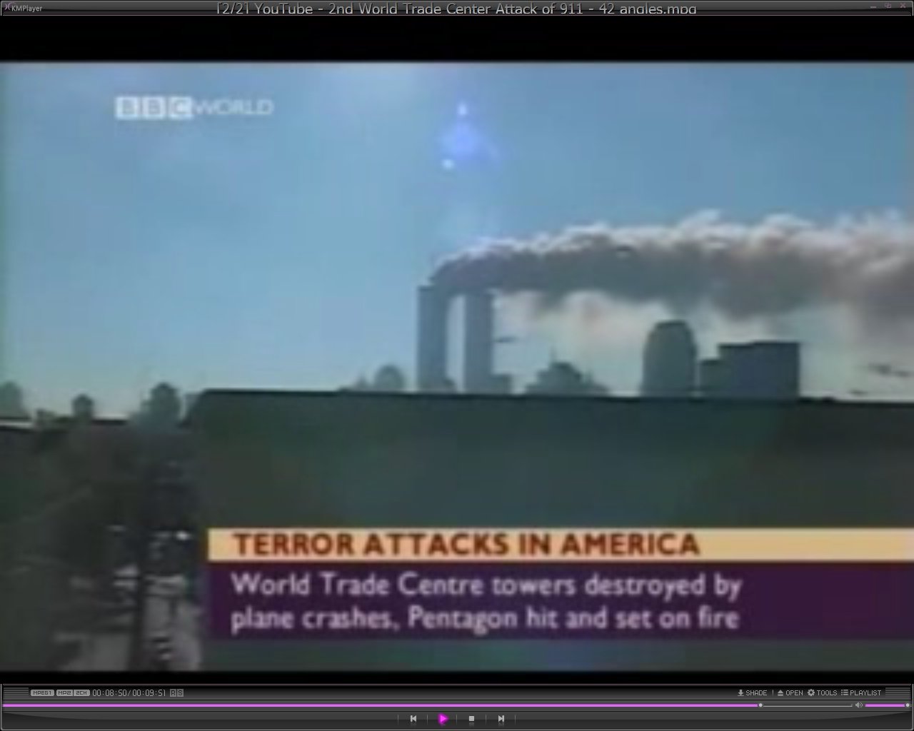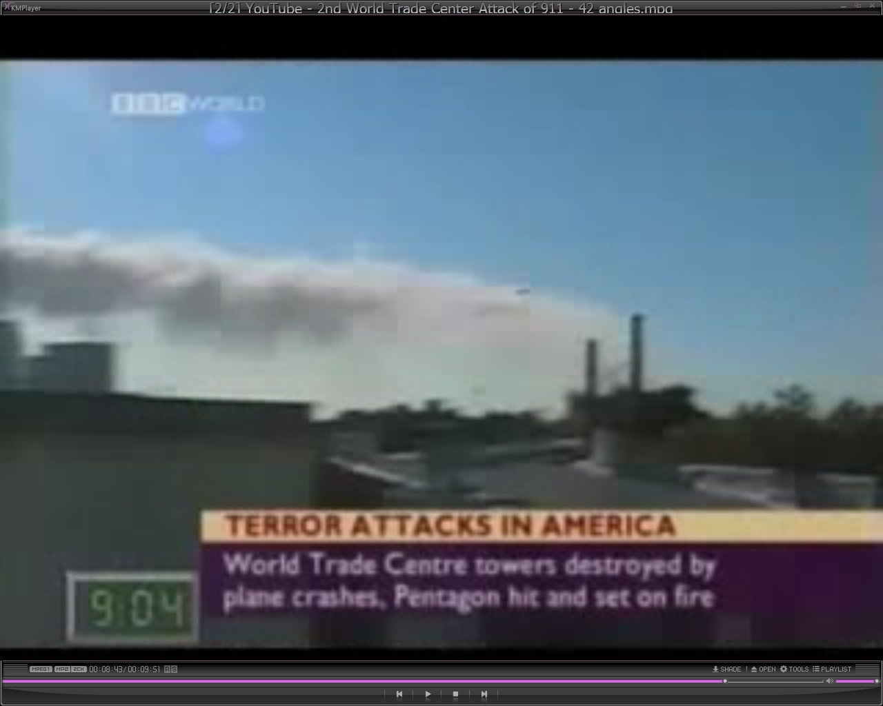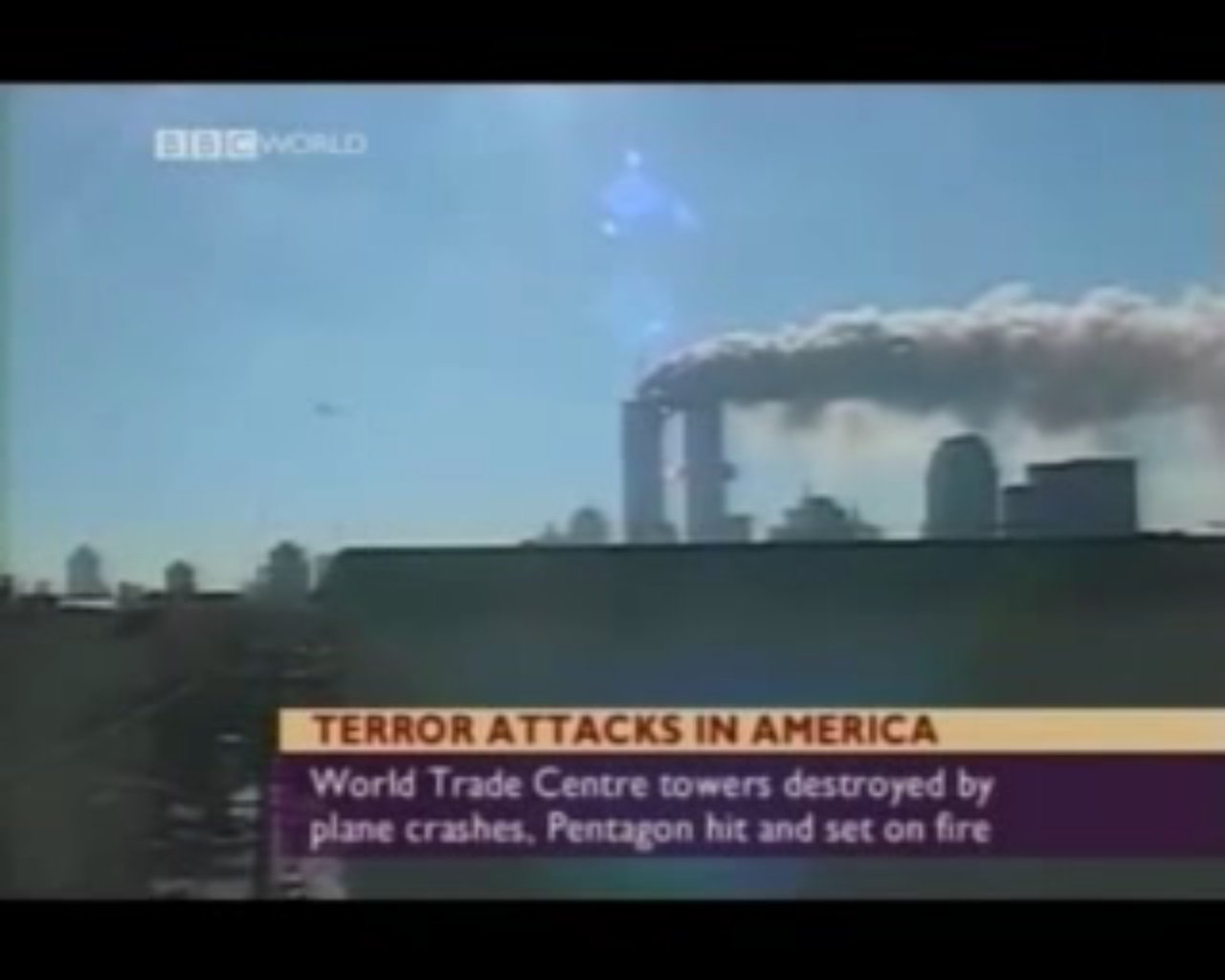 As "Flight 175" reaches WTC2, a vapor trail appears on the right side of the screen moving toward the WTC: