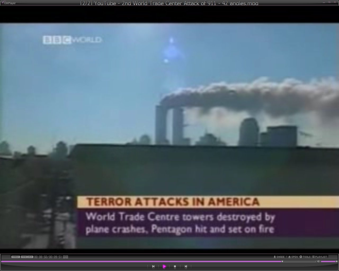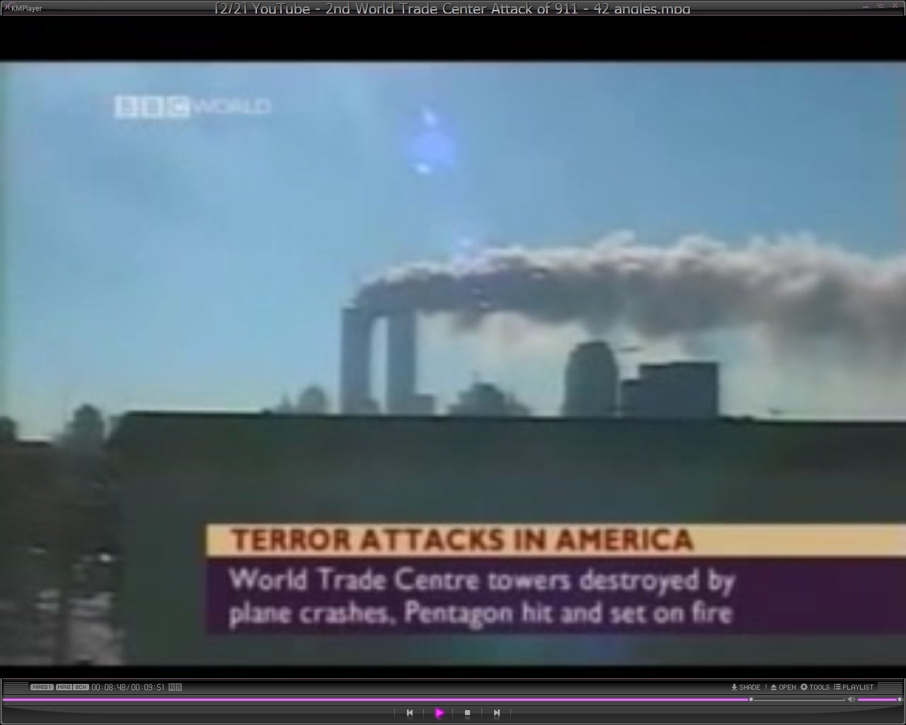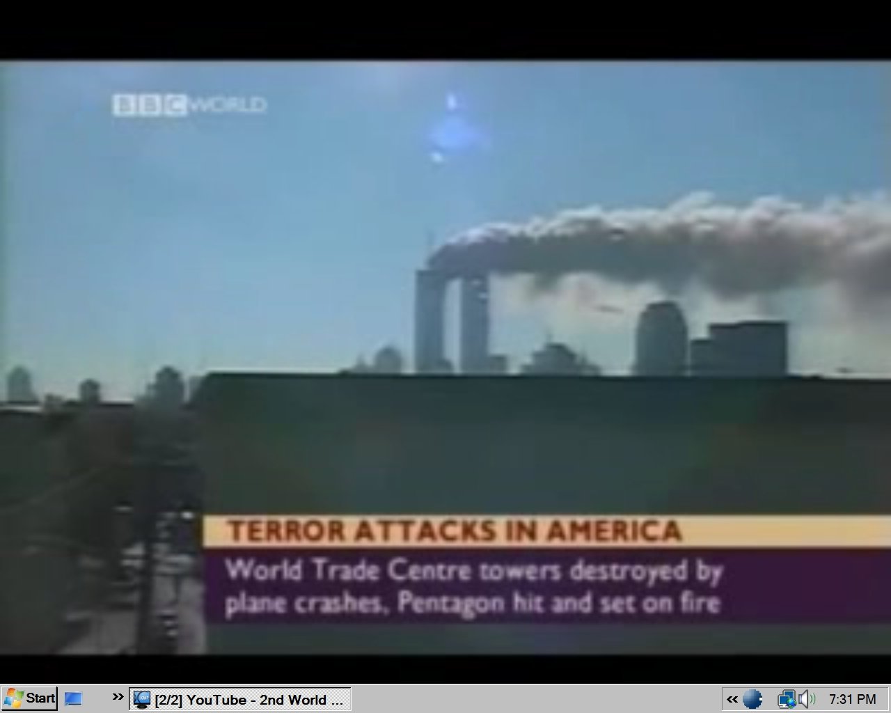 As "Flight 175" reaches WTC2, a vapor trail appears on the right side of the screen moving toward the WTC: